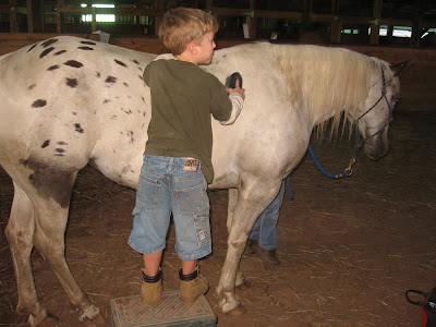 We had another lovely romp in Barb Taylor's stable yesterday. Hannah and Luke are really coming along nicely with their riding lessons. I can't get over how comfortable they are around a horse. They took a lot of time grooming Tybaby, scratching all the flybites and brushing all the nooks and crannies. When Luke was finished and the saddle was off, we turned around to find Luke underneath her, stroking her belly with a little brush. Hannah braided her mane and Luke learned to lunge her. Too cute...I wish I could take them for a lesson every day but Barb is extremely busy getting in hay. Have to make hay while the sun shines, and no animal burns hay like a horse.